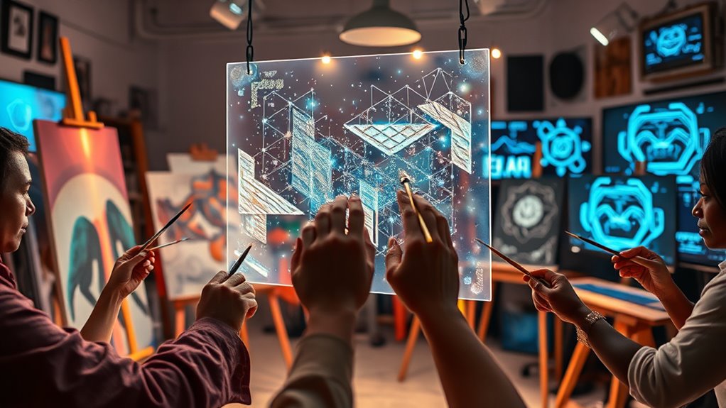 Creative collaboration with AGI transforms art by blending your imagination with machine intelligence, pushing the boundaries of traditional methods. As you work with AI, you can explore new styles, ideas, and mediums more efficiently. This partnership encourages innovative expressions, reshapes authorship, and challenges perceptions of originality. Ethical use guarantees trust and responsibility in your creative journey. If you want to discover how this synergy can open fresh artistic horizons, keep exploring these exciting possibilities.