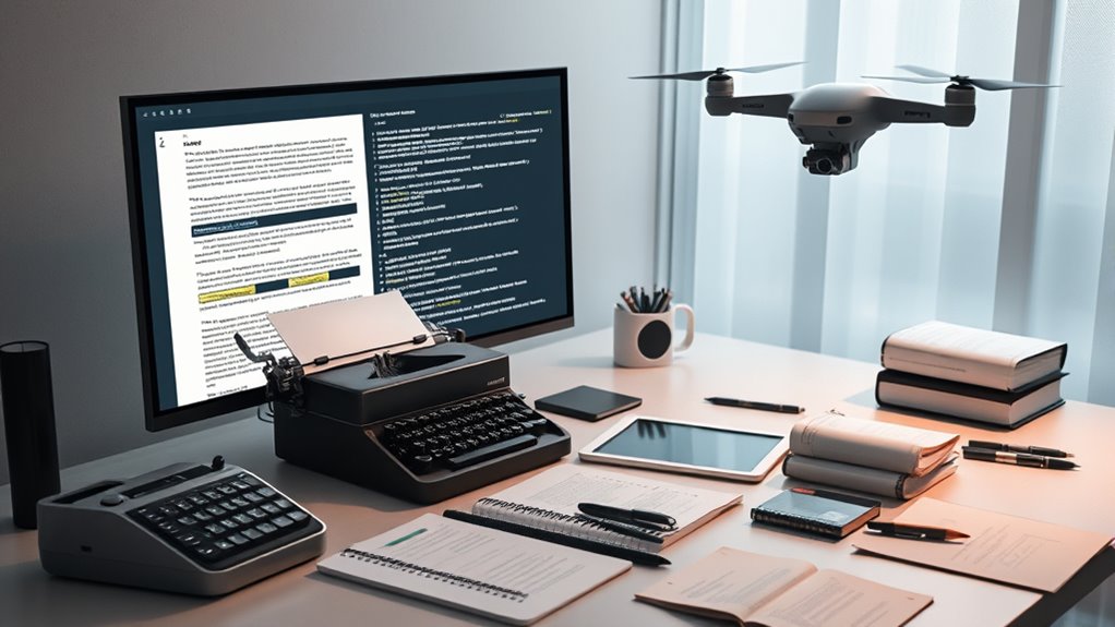 AI is changing screenwriting jobs by automating idea generation and helping develop story ideas faster. It streamlines the creative process, providing new tools for brainstorming and testing story variations. While AI can handle initial concepts, your unique voice, emotional depth, and ethical considerations remain essential. This shift offers opportunities to innovate but also raises questions about creativity and job security. To understand how to adapt and thrive with these changes, keep exploring what’s next in AI’s role in storytelling.