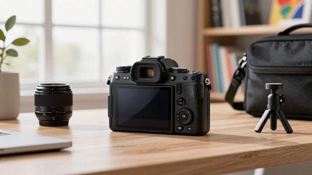 Mirrorless cameras revolutionize your workflow efficiency like nothing else. With their lightning-fast autofocus accuracy, you capture perfect shots instantly, saving you hours of retakes. The incredible lens versatility lets you switch from wide-angle to telephoto seamlessly, streamlining your creative process. This tech boost means less time fussing with equipment and more time creating, making your entire workflow smoother, quicker, and more productive—your creative genius liberated!