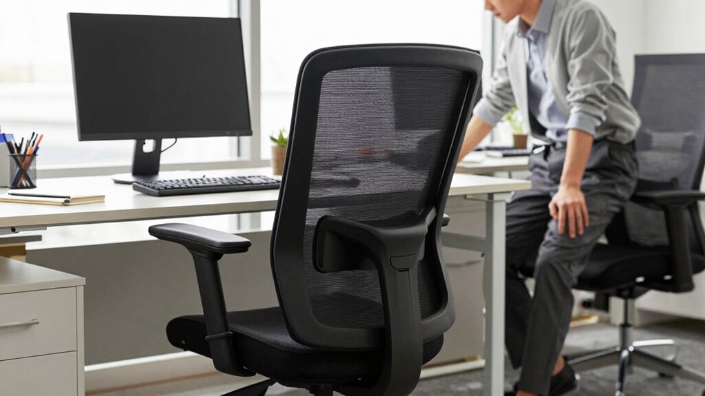 You should check your ergonomic chair’s adjustments at least once a month to maintain proper posture. Regular adjustment frequency guarantees your posture stays aligned, preventing discomfort and musculoskeletal issues. If you notice any discomfort or your body position changes, it’s time to readjust immediately. Consistently maintaining correct posture through proper chair adjustments helps you stay comfortable and productive during long hours of knowledge work.