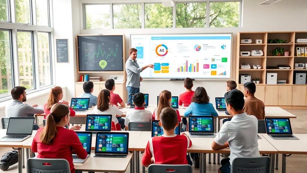 Classroom engagement becomes a key factor when integrating AI into your teaching. To capture students’ interest, you can use interactive tools like AI-driven simulations, chatbots, or coding projects. These activities make learning more dynamic and relatable, sparking curiosity and active participation. When students work directly with AI applications, they see firsthand how these systems operate, which demystifies complex concepts. To maximize engagement, you should tailor activities to different learning styles, providing opportunities for collaboration, problem-solving, and creativity. This hands-on approach makes students feel empowered, transforming the classroom into a space where they can experiment, ask questions, and learn from mistakes.