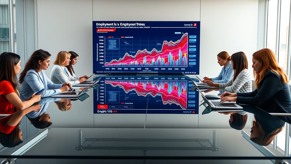 Budget Lab’s study shows AI is changing employment by automating routine tasks and shifting skill requirements. You’ll notice more jobs focus on human-centric abilities like emotional intelligence, strategic thinking, and adaptability. Employers are investing in training to help workers stay relevant in this new landscape. Developing continuous learning habits and mastering digital skills can boost your resilience and career prospects. Keep exploring to discover how to best prepare for these workplace shifts.