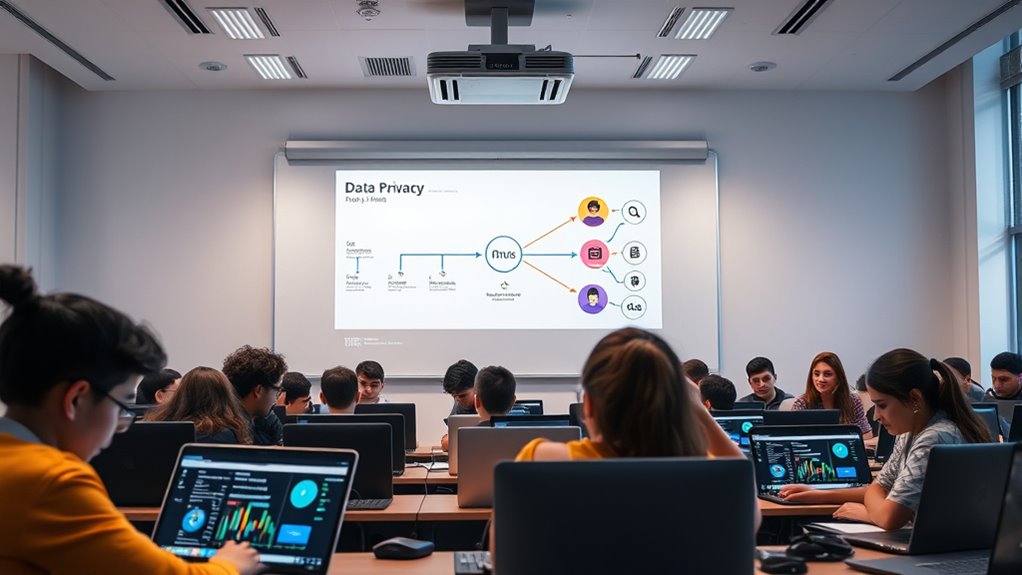 When using AI platforms for learning, it’s essential to understand how your student data is collected, stored, and shared. These platforms gather information like assignments, quiz results, and interactions to personalize your experience. They should have clear privacy policies explaining what data is used and who has access. Encryption and security measures protect your info, but stay aware of privacy settings and updates. To learn more and keep your data safe, explore the platform’s policies carefully.