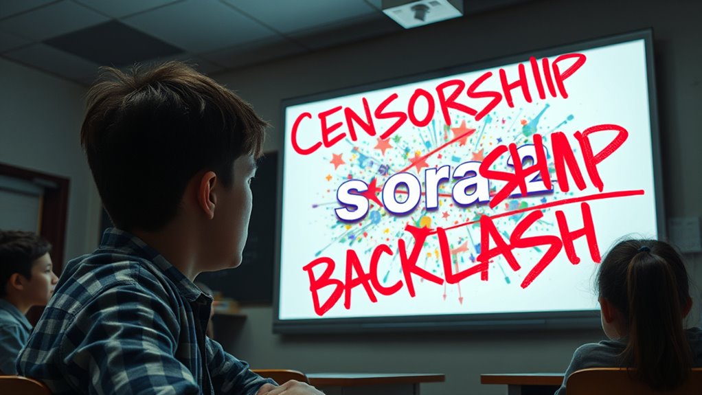 OpenAI’s Sora 2 has sparked a copyright backlash in schools because of concerns about AI-generated content and intellectual property rights. Educators worry about unintentional plagiarism and misuse of copyrighted materials, while students’ privacy risks also raise alarms. Institutions want to balance innovative AI tools with legal and ethical protections. If you keep exploring, you’ll discover how schools are responding to these issues and what measures can help protect everyone involved.