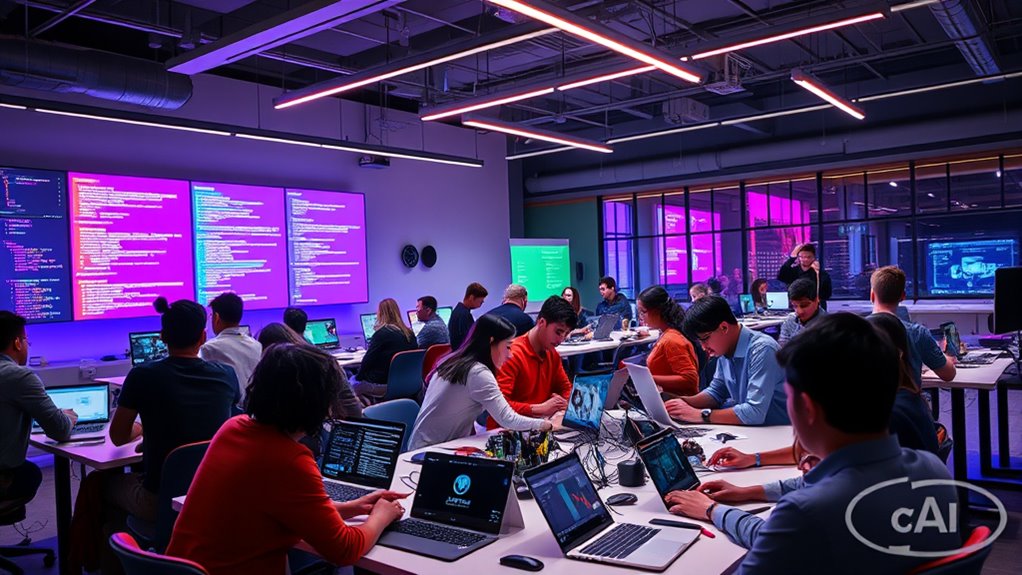Participating in hackathons and prototype shops offers hands-on opportunities to develop AI tools with these principles in mind. These events challenge you to craft innovative solutions while steering through ethical dilemmas and privacy concerns. Arcade AI, for instance, demonstrates how AI can be used to create engaging, personalized learning experiences without compromising student confidentiality. Throughout these initiatives, you’re encouraged to collaborate with educators, students, and policymakers to guarantee that AI is aligned with societal values and educational standards.