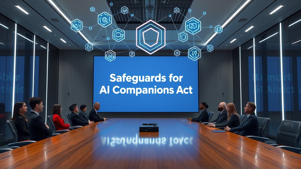 The New York’s Safeguards for AI Companions Act sets clear rules to protect your privacy, promote ethical AI development, and guarantee accountability. It requires companies to be transparent about data collection, obtain your explicit consent, and prevent harm or discrimination. The law also encourages ongoing oversight and stakeholder engagement to adapt to emerging challenges. If you keep exploring, you’ll discover how these measures shape a safer and more trustworthy AI environment for everyone.