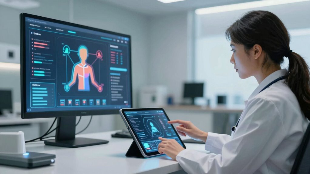 Alongside robotic diagnostics, personalized messaging plays an essential role in improving follow-up communication. Instead of generic follow-up calls or emails, AI-driven systems craft tailored messages based on your specific health data and history. This means you’ll receive relevant, timely updates and reminders that resonate with your individual needs. For example, if your blood pressure readings fluctuate, you might get a targeted message suggesting lifestyle adjustments or prompting a consultation. This personalized approach fosters a sense of connection and trust, making you feel truly cared for rather than just another patient in a queue. It also encourages better adherence to medication schedules and lifestyle recommendations, which are critical for recovery and ongoing health.