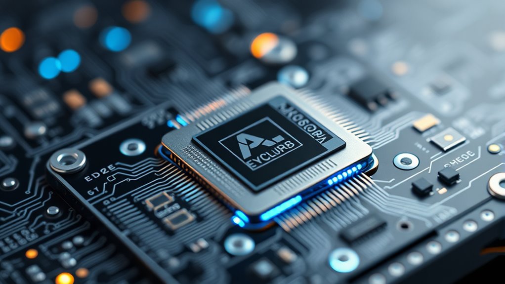 You might think edge AI chips complicate data privacy, but they actually help. By processing data locally, you keep sensitive info on-site, supporting data localization and easing regulatory compliance. Ironically, instead of risking breaches through cloud transmission, you gain better control over data. This smarter approach reduces vulnerabilities, making your IoT devices more secure, private, and compliant—so you can focus on innovation rather than worry about data leaks.