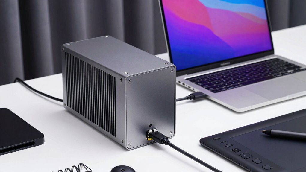 In today’s fast-paced creative world, external GPU enclosures are your trusty sidekick, turbocharging your workflow and revealing new possibilities. They make demanding tasks smoother, letting you craft without limits—think of them as your modern-day Excalibur. Just like the inventors of yore, you’re embracing innovation to stay ahead. So, gear up, connect your enclosure, and watch your creative powers soar—because the future of creation is just a plug away.