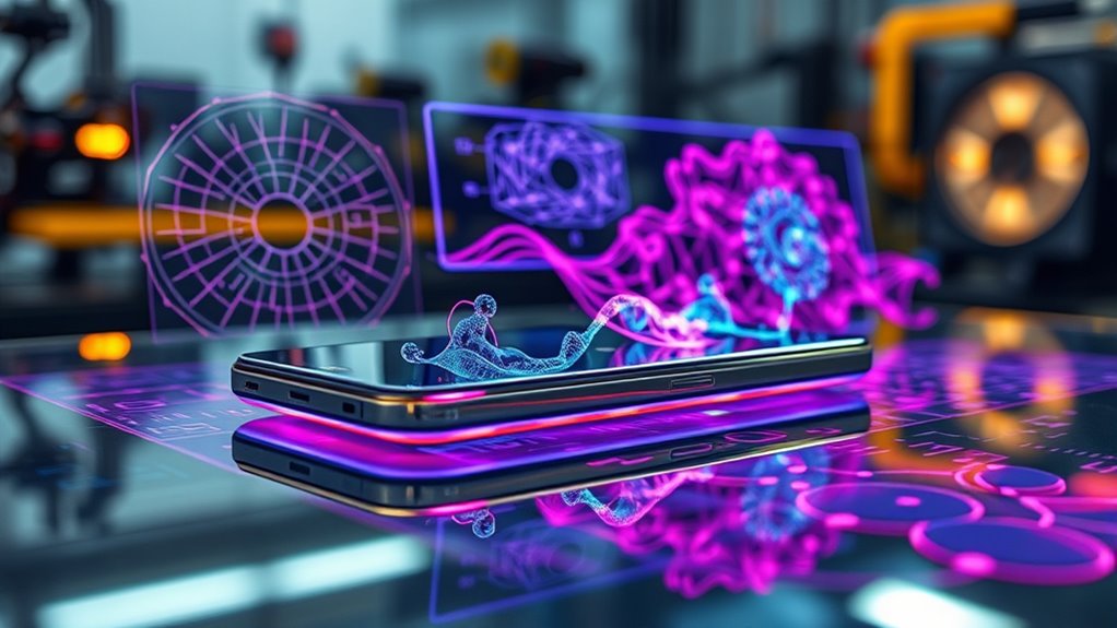 You’ll see future innovations like AI-powered materials that adapt and evolve, enhancing device performance and sustainability. Smart interface integration will become more seamless, allowing you to interact intuitively with your gadgets. These advancements will work with generative design to create personalized, efficient products, reducing waste and boosting functionality. As technology progresses, expect smarter, more responsive electronics that fit your needs perfectly and contribute to a greener environment.