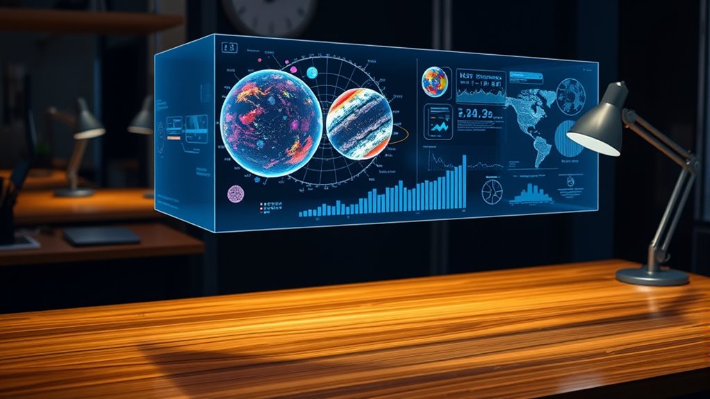 You’re witnessing a tech revolution—holographic displays are becoming more than sci-fi dreams, now fitting right onto your desk. With advancements increasing display resolution by over 50% in just the past year, these holograms are sharper and more realistic than ever. Imagine collaborating with 3D models floating in mid-air or viewing immersive data visualizations effortlessly. As this technology progresses, it’s clear holographic displays will soon transform how you work, learn, and communicate, making the future more interactive and visually stunning.