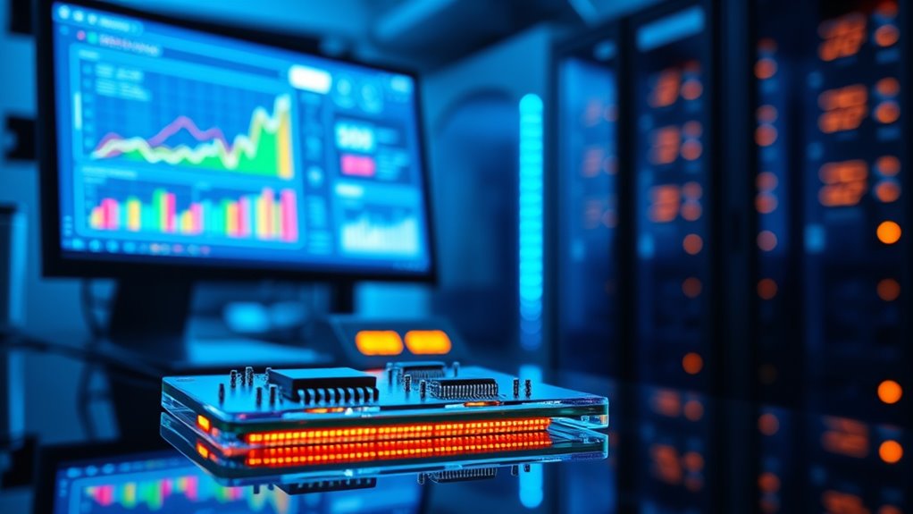 Intel is heavily investing in AI-driven chips to boost its market position, focusing on innovative architectures tailored for AI workloads. These efforts aim to deliver higher performance, lower latency, and better energy efficiency, attracting cloud providers and enterprises. Their strategic investments include funding research and acquiring startups, helping them stay ahead of competitors like NVIDIA and AMD. As Intel expands its AI ecosystem, you’ll discover how their advancements could reshape industry standards and market dynamics.