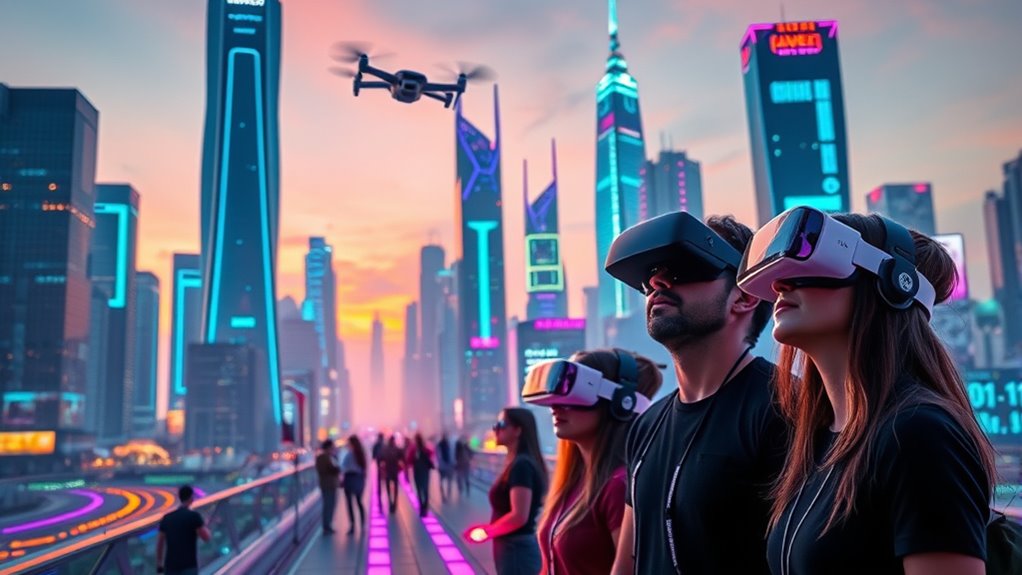 By 2025, the metaverse will become a mainstream part of your daily life, blending digital and physical worlds through advanced augmented reality glasses. You’ll experience seamless virtual activities like concerts and social meetups from home, with interactions feeling real and intuitive. Blockchain will secure ownership of digital assets and support a thriving economy, while decentralized communities let you participate actively and move your digital identity across platforms. As these innovations unfold, you’ll see how virtual worlds are evolving into an all-encompassing digital landscape—there’s more to explore ahead.