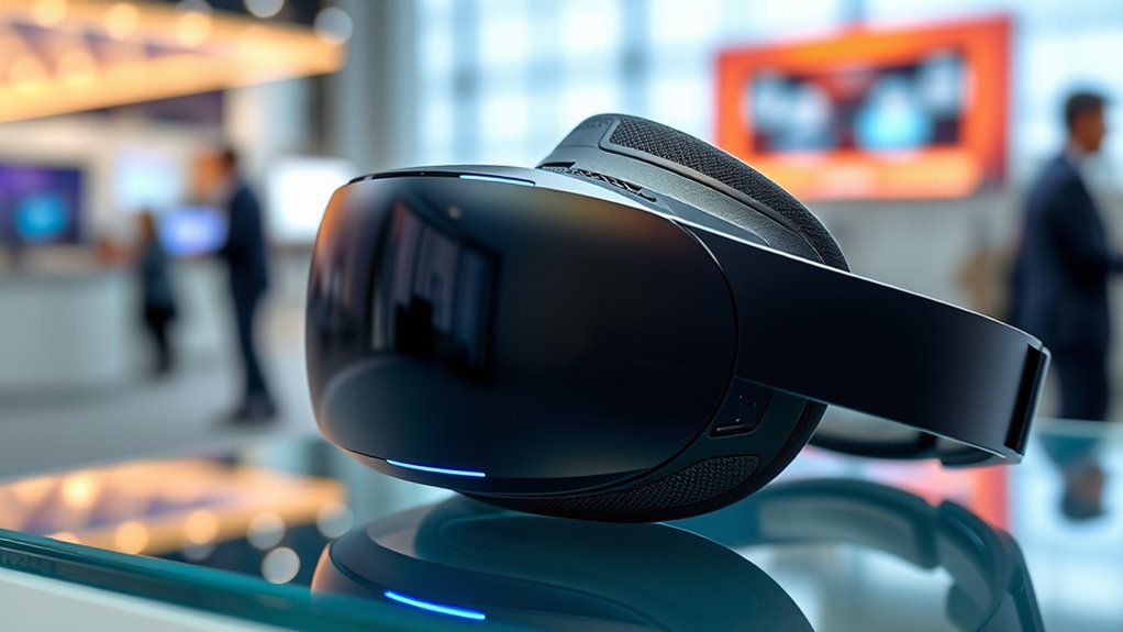 Samsung’s Galaxy XR headset offers an immersive experience with high-resolution displays, wide field-of-view optics, and augmented reality capabilities that blend digital overlays seamlessly into your real environment. It features intuitive gesture and voice controls, making interaction simple and natural. Designed for comfort with a lightweight, ergonomic fit, it appeals to both casual users and professionals. Its innovative mix of AR and VR sets a new standard in immersive tech—discover more about how it’s shaping the market.