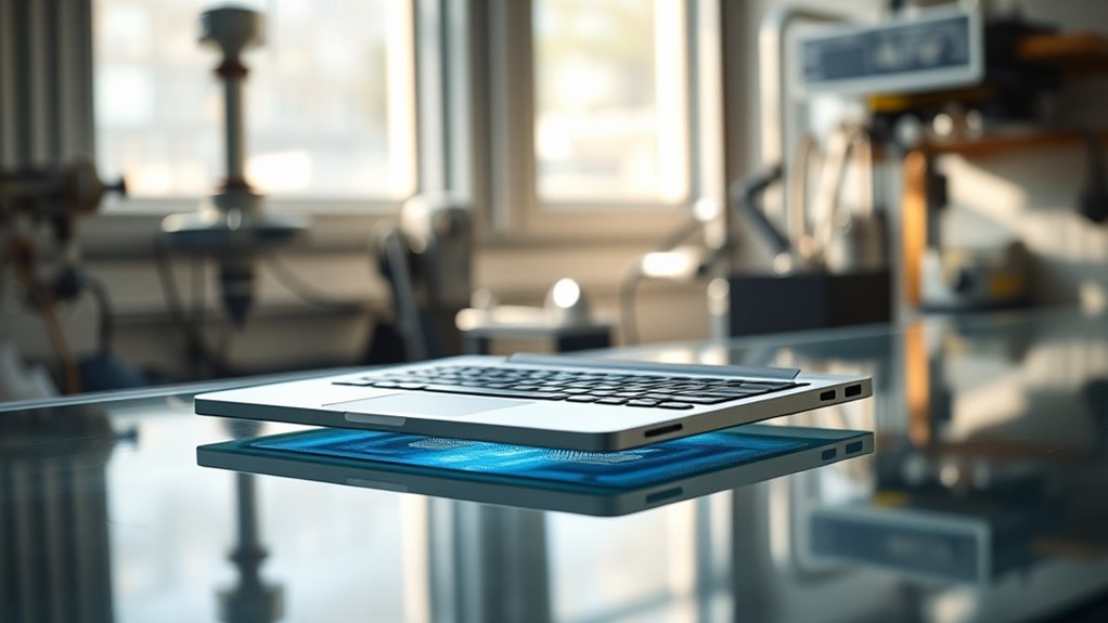 Solid-state batteries are revolutionizing portable tech by offering longer-lasting, safer power. With advanced materials like ceramic and sulfide electrolytes, they can increase energy density and reduce risks like dendrite formation. This means your laptop could run for a week on a single charge. While manufacturing is challenging, ongoing innovations are bringing commercial versions closer. Keep exploring to discover how these breakthroughs will reshape your devices and your daily life.