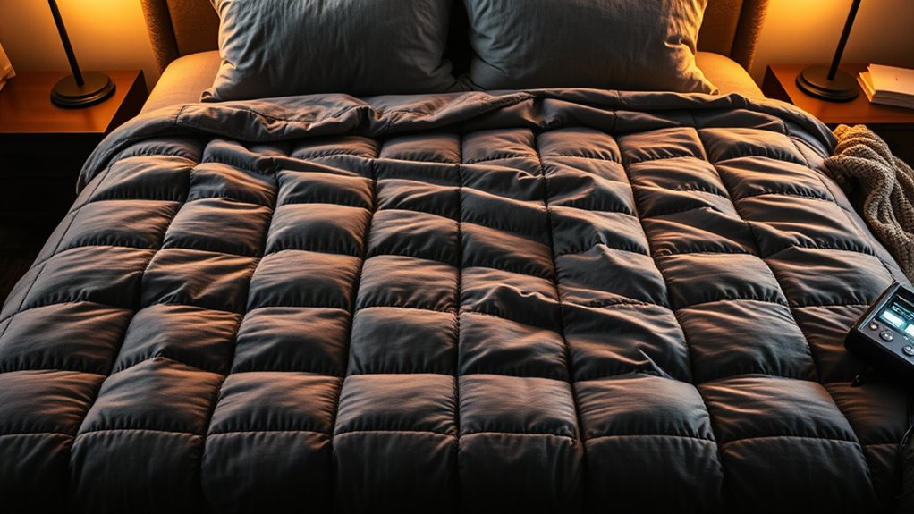 Choosing the right size and ensuring compatibility are essential steps when selecting a king-size dual control electric blanket. I always check that the blanket’s dimensions, like 90″ x 100″, match my mattress to guarantee full coverage and comfort. It’s important to verify that the blanket fits your bed size—whether king or queen—to avoid gaps or inadequate warmth. I also pay attention to the length of the control cords, making sure they’re long enough to place controls conveniently without clutter. Additionally, I consider whether the blanket size accommodates any extra bedding or mattress toppers I use. For couples, selecting a size that offers ample coverage for both sleepers is critical, especially with dual-control models designed to meet different temperature preferences.