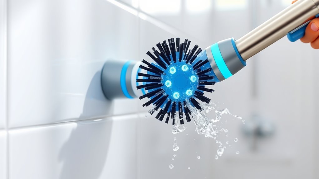 Water resistance and durability are crucial features to contemplate because they directly impact the longevity and safe operation of an electric spin scrubber. I always look for models with an IPX7 waterproof rating or higher, ensuring they can handle water exposure during cleaning without damage. It’s important that the motor and electronic components are sealed or protected from water ingress. Waterproof brush heads are a bonus—they make maintenance easy since I can rinse them directly under water. I also prioritize handles and bodies made from sturdy, corrosion-resistant materials like stainless steel or high-quality plastic to withstand humid environments. Overall, a well-built, water-resistant design ensures the scrubber lasts longer and operates safely, even in wet or damp conditions.