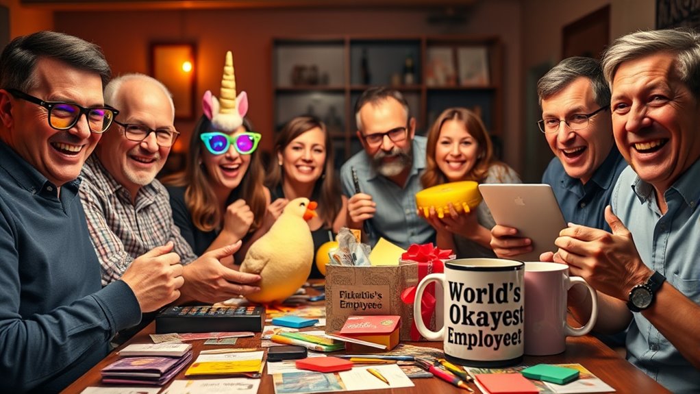 Choosing gag gifts for coworkers is like picking the perfect punchline for a joke—they should hit just right. I consider their personalities and office vibe, opting for lighthearted, non-offensive items that spark smiles. Avoid anything too personal or controversial. Think quirky desk gadgets, funny mugs, or silly stress balls. The goal is to make everyone laugh without crossing boundaries, turning the gift into a memorable office moment.