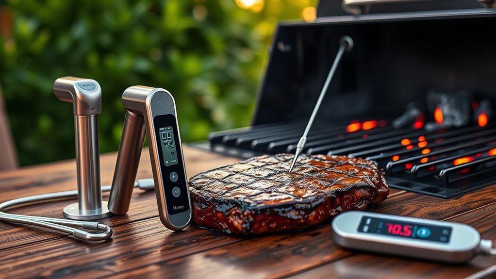 When it comes to grilling, an easy-to-use meat thermometer can make all the difference between perfectly cooked meat and a smoky mess. I look for one with a simple setup and intuitive controls, so I don’t waste time fiddling. A clear, large backlit display helps me read temperatures easily, even in low light. Features like preset alarms and straightforward calibration make grilling hassle-free, whether I’m a beginner or a pro. Wireless connectivity to a user-friendly app lets me monitor temperatures from my phone without fuss. An ergonomic design feels comfortable in my hand, and minimal maintenance, like dishwasher-safe probes, keeps things simple. Overall, a thermometer’s ease of use guarantees I can focus on grilling, not troubleshooting.