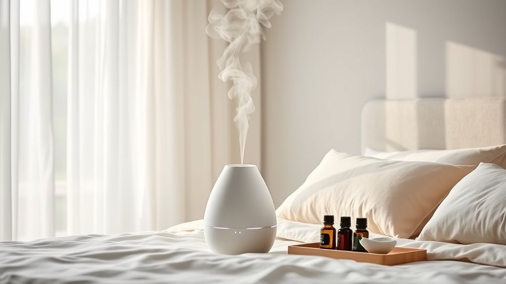 Many humidifiers now feature built-in aromatherapy options, allowing me to add essential oils for a calming scent experience. This turns a simple device into a wellness tool, helping to reduce stress and improve sleep. However, compatibility with essential oils varies—some humidifiers are designed specifically for oils, while others may be damaged by certain types. Checking the manufacturer’s recommendations is vital to avoid issues. When used properly, aromatherapy can enhance indoor air quality and create a more relaxing environment. Still, I need to remember that oils can leave residue or mold if the humidifier isn’t cleaned regularly. Proper maintenance ensures I get the benefits without risking device damage or compromised air quality. Aromatherapy features can truly elevate my bedroom’s comfort and ambiance.