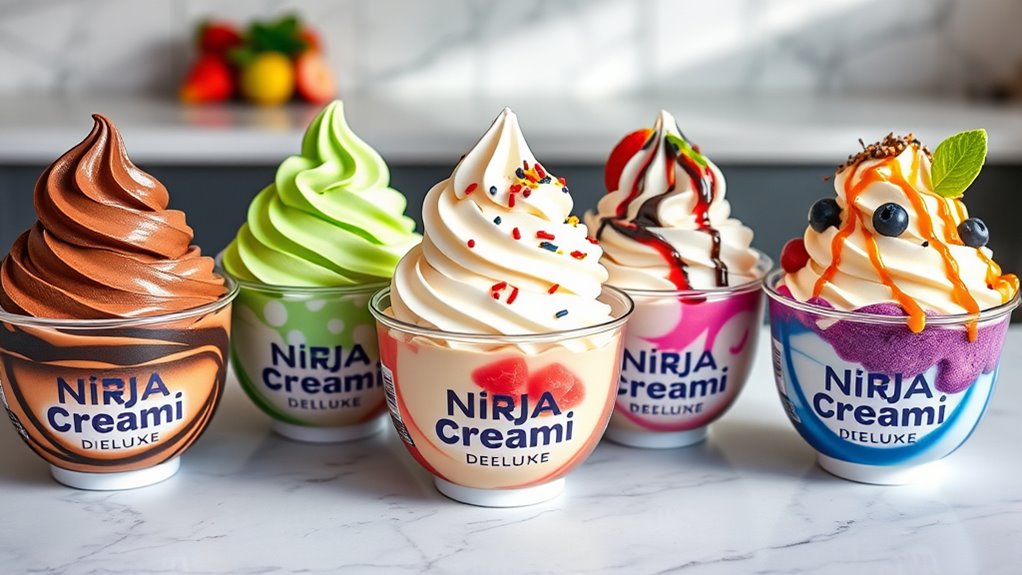 Variety in flavor options truly enhances the versatility of the Ninja Creami Deluxe, making it easier to enjoy a different frozen treat every time. A diverse range of flavors allows for customization and caters to various taste preferences, from classic vanilla and chocolate to fruity options like berry or mango. Including layered recipes or those with mix-ins creates visually appealing, complex desserts that stand out. Flexibility in flavor profiles also helps accommodate dietary restrictions, such as sugar-free or low-fat choices. Having a well-rounded selection guarantees I never get bored, as I can always find a new flavor or combination to try. This variety keeps the experience exciting and ensures I can satisfy different cravings with ease.