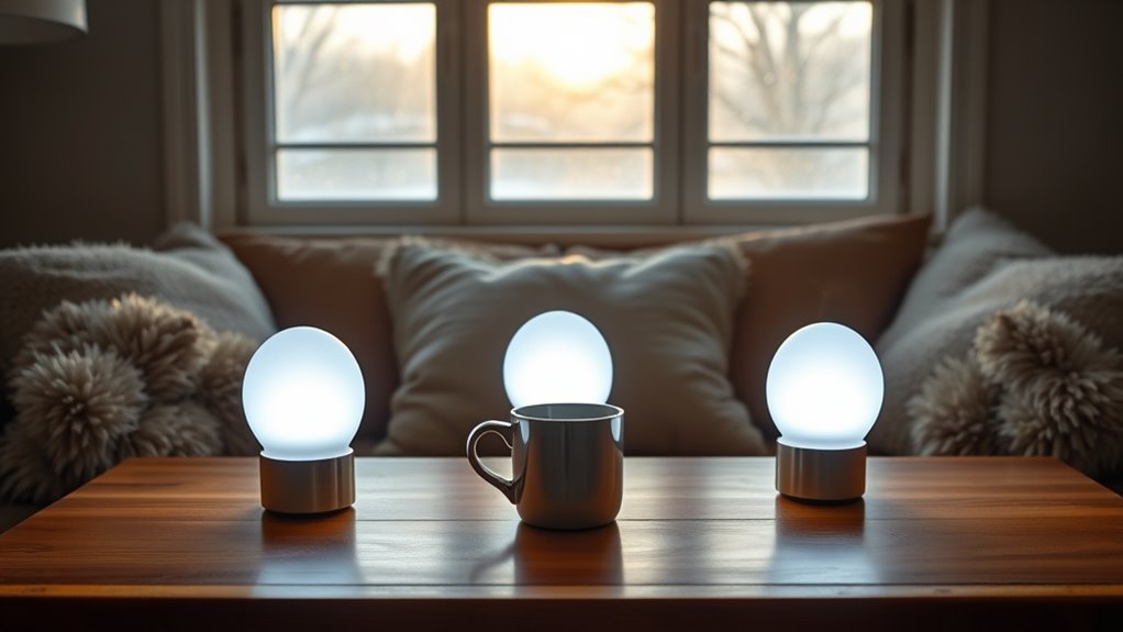 If you’re looking to brighten your mood during winter, I recommend these five top sad lamps. They each offer 10,000 lux full-spectrum, UV-free light, with features like adjustable brightness, timers, and portability for easy use at home or work. Designs include sleek, compact, and even wall-mountable options. For effective relief from winter blues, choosing the right lamp matters. Keep going to find out which one might suit your needs best.