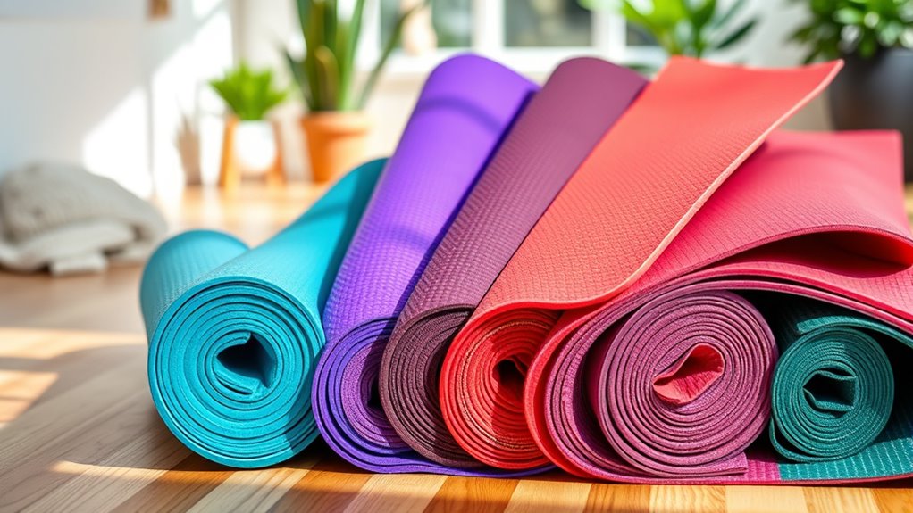 Choosing the right thickness for your yoga mat is essential to balancing comfort and stability. Thicker mats, around 1/4 inch or more, offer better cushioning, which helps protect your joints and reduces pressure during poses. This is especially beneficial if you have sensitive knees, hips, or back, making your practice more comfortable. On the other hand, thinner mats, about 1/8 inch, provide increased stability and a closer connection to the ground, ideal for balancing poses and advanced practices. The key is finding a thickness that suits your personal needs—whether you prioritize comfort or stability. Remember, too much cushioning can compromise stability, while too little may cause discomfort. Ultimately, the right balance enhances your practice and helps prevent injuries.